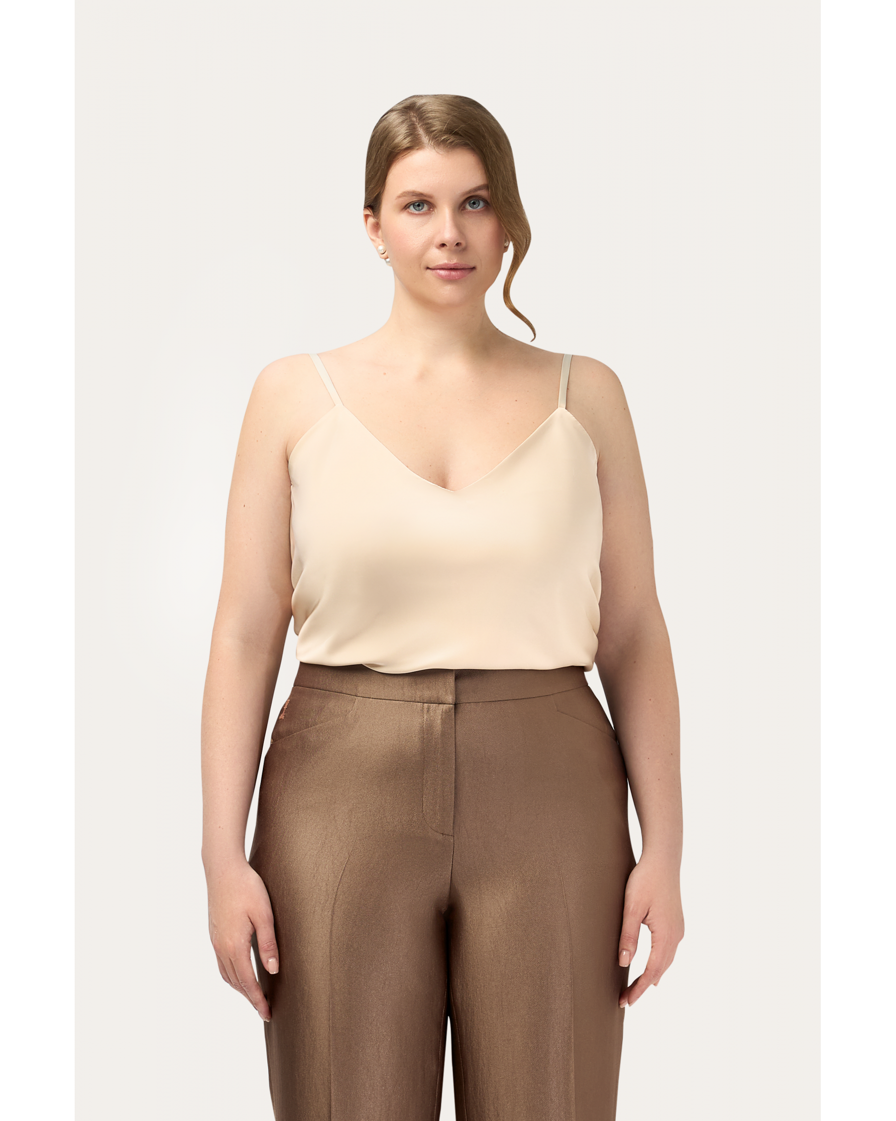 - Топ на бретелях - воплощение цветущей элегантности. Его оттенок — не кричащий белый, а мягкий и благородный цвет лепестков пиона, с едва уловимым теплым, кремовым подтоном. Он словно излучает мягкий свет, выгодно подчеркивая линию шеи, плеч и загар.