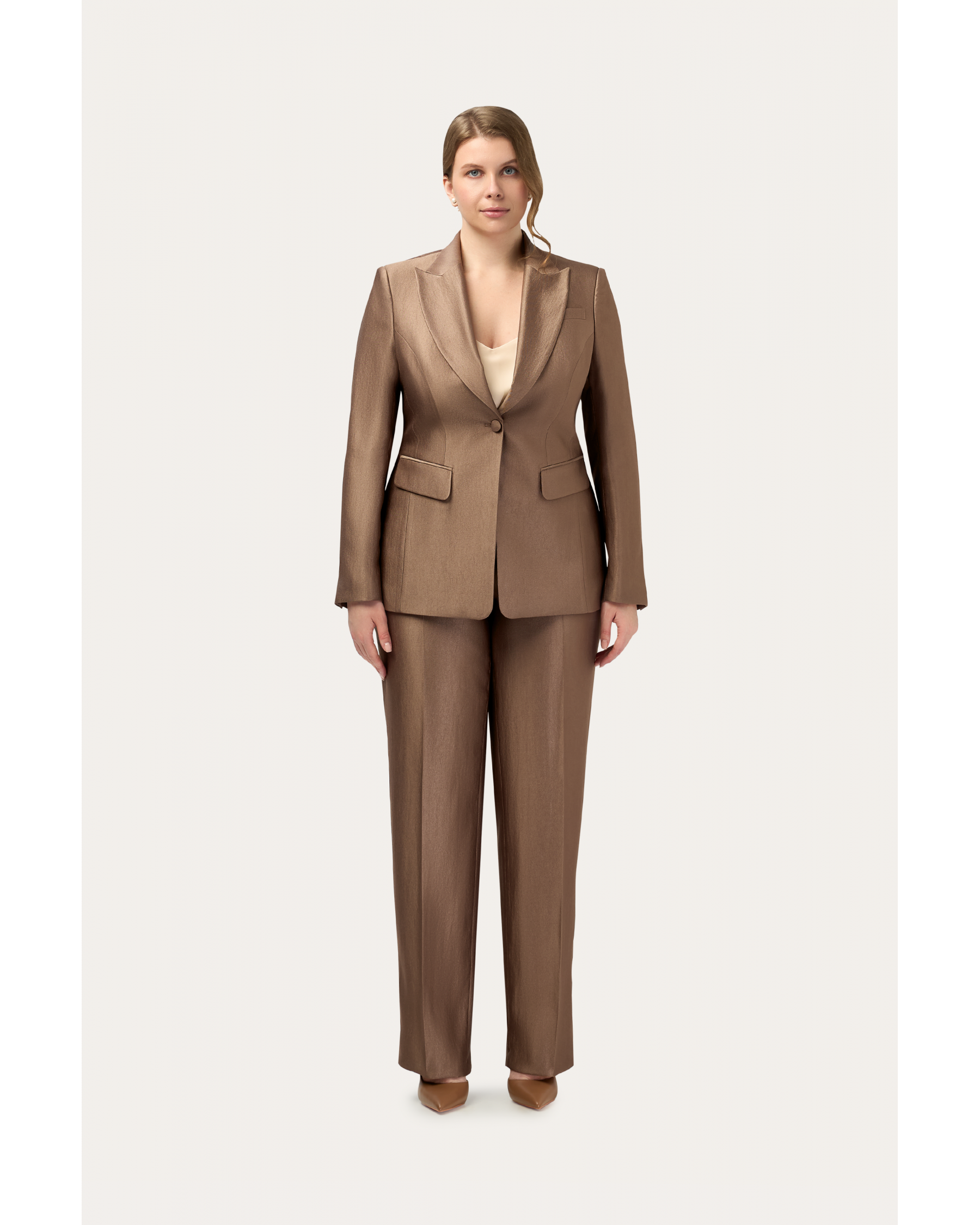 - Прямые брюки — идеальный баланс между строгой элегантностью и непринужденной легкостью. Их четкий, вытянутый крой контрастирует с мягкой пластичностью жакета, создавая динамику в образе. Они — воплощение стабильности и уверенности.