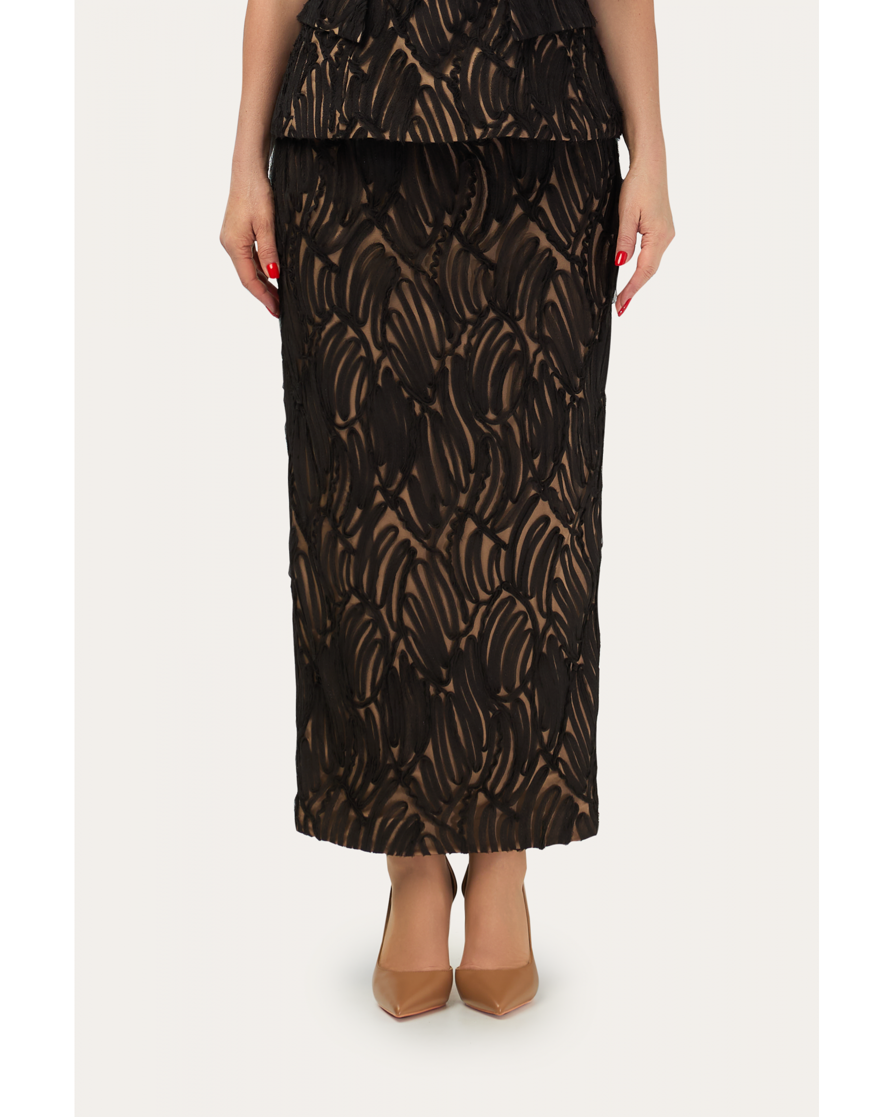 Юбка удлиненного формата, создающая архитектуру вытянутого силуэта. Высокий пояс акцентирует талию, а прямой крой визуально выстраивает строгие вертикальные линии.