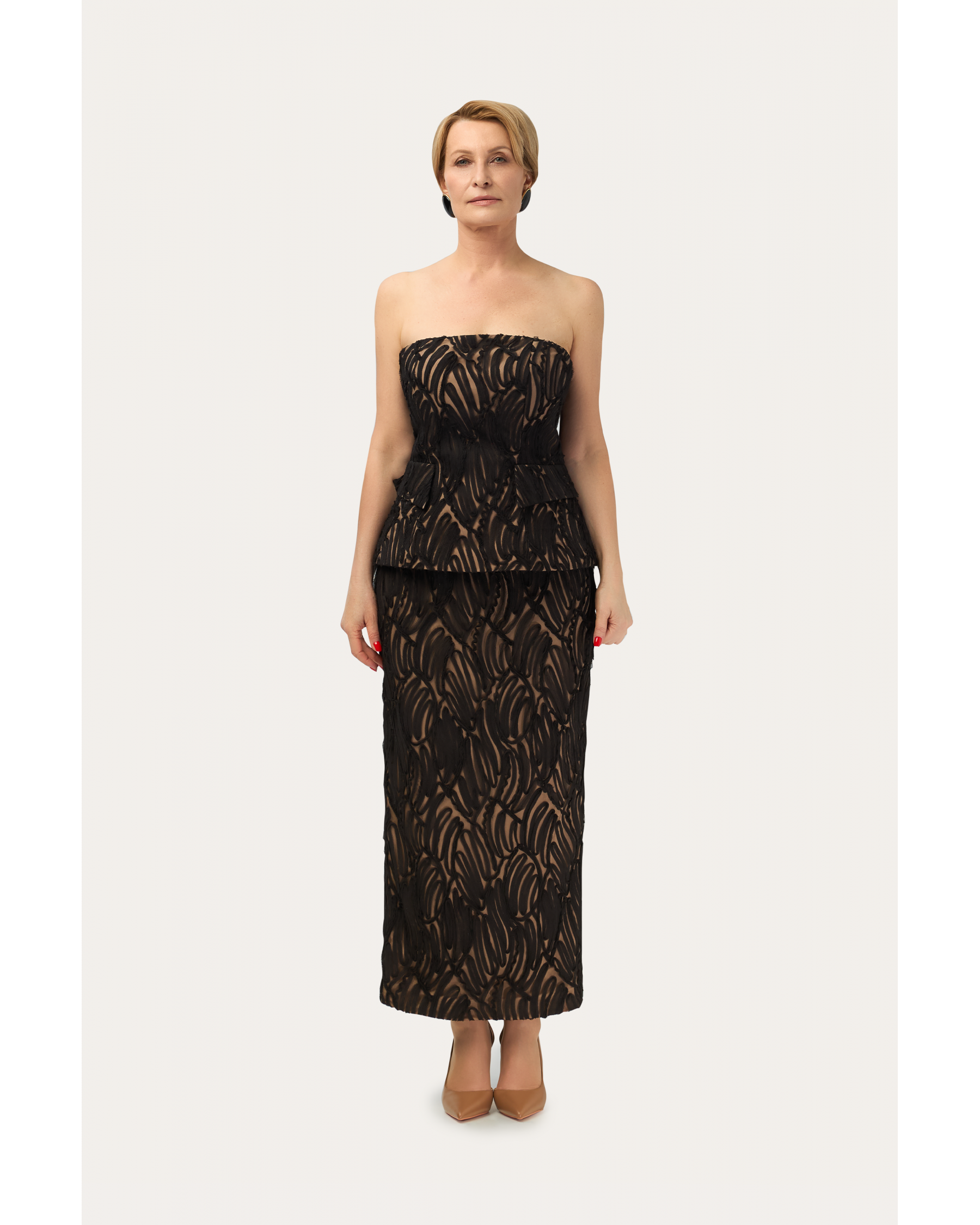Изготовлена из инновационного полотна с эффектом голого тела, повторяющего оттенок жилета-корсета. Сочетание матовой текстуры и микро-блеска подчеркивает глубину сложного черного пигмента.